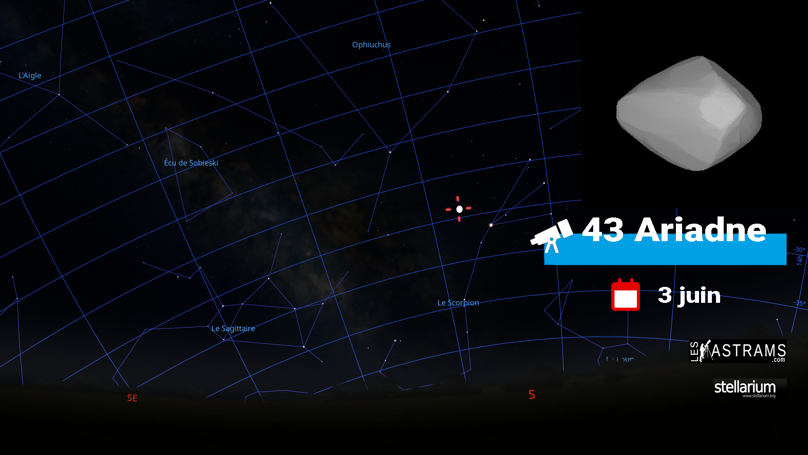 Lundi 03 03:23 Opposition de l'astéroïde 43 Ariadne avec le Soleil (dist. au Soleil = 1,864 UA; magn. = 9,1). De Nice , Ariadne est visible entre 00:56 et 01:58. Il deviendra accessible vers 00:56, quand il s'élèvera à une altitude de 21 degrés au-dessus de l’horizon sud. Il atteindra son point culminant dans le ciel à 01:27, 22 degrés au-dessus de l’horizon sud. Il disparaitra vers 01:58 quand il s'enfonce en dessous de 21 degrés au-dessus de l'horizon sud. CARTE