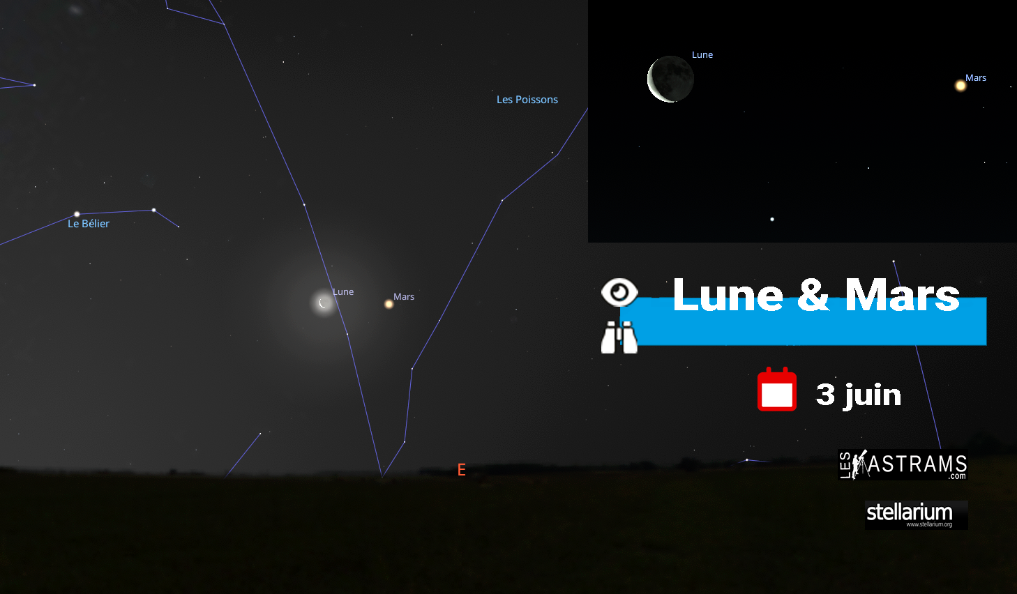 Lundi 03 rapprochement entre Mars et la Lune. A l’aube et très bas à l’horizon Est. Saturne est plus haut au Sud-Est. CARTE