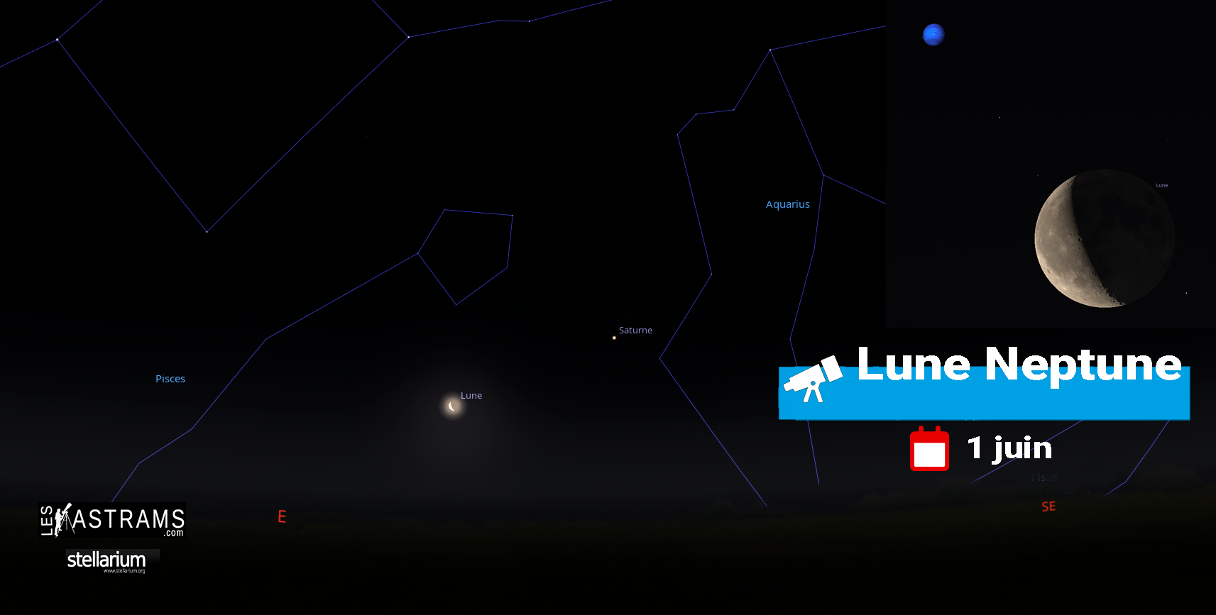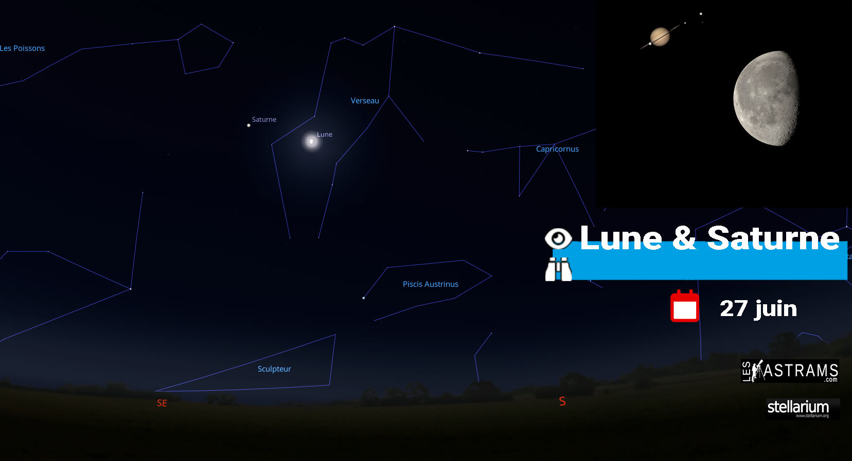Jeudi 27 juin rapprochement entre Saturne et la Lune. A l’aube au Sud-Est dans le Verseau. CARTE